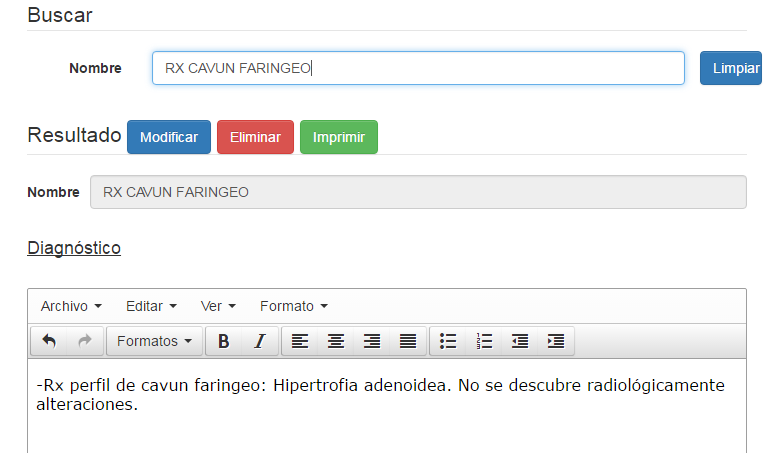 ClinicaWEB posee mas de 300 Plantillas predeterminadas de diagnóstico por imágenes. Cree sus propias plantillas y aumente su productividad hasta en un 80%. Con nuestro avanzado editor de texto podrá crear cualquier formato que desee, títulos, subrayado, bloques, espaciado, diferentes tipos de letra y mas. Seleccione la plantilla de diagnóstico que desea utilizar y haga modificaciones. Cree plantillas vacias con diferentes tipos de formato.