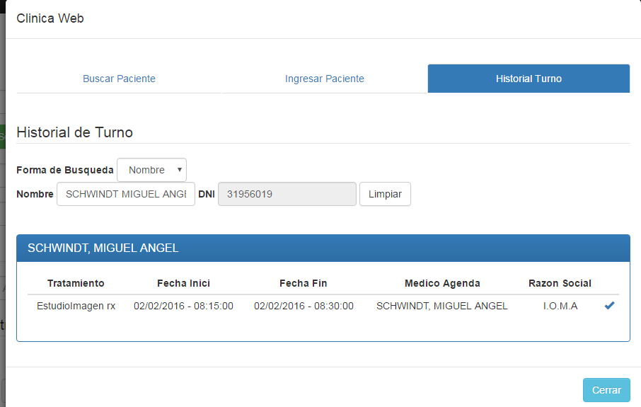 El ingreso de pacientes puede llevarse a cabo vía autocompletado de nombre y apellido o bien podrá seleccionar a un paciente desde el historial del turnero. En esta última opción nuestro sistema presenta una optimización ya que completará todos los campos con los datos del usuario, médico que deriva, obra social y prácticas médicas obtenidas el día que se generó el turno. Optimizamos su administración para que pueda trabajar de menera mas óptima
